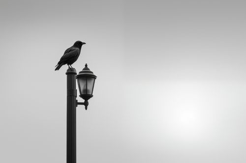 Obraz z serii wnętrza zatytułowany Samotny Postój Kruka. Prezentuje on sylwetkę kruka spoczywającego na klasycznej latarni ulicznej, uchwyconą w monochromatycznej palecie szarości. Ten spokojny, lecz sugestywny plakat jest symbolem refleksji i tajemnicy, doskonale wpisując się w klimat współczesnych przestrzeni miejskich. Praca ta z pewnością stanie się wyrazistym dodatkiem do nowoczesnych wnętrz, takich jak lofty czy minimalistyczne salony, a także wniesie element zastanowienia do przestrzeni publicznych takich jak galerie, kawiarnie i biblioteki, gdzie odosobnienie miesza się z miejskim zgiełkiem.