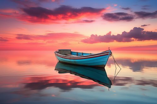 Plakat z serii pejzaże zatytułowany Spokój przed Połowem. Ta malownicza scena przedstawia samotną łódź na tafli wody, z tłem zachodzącego słońca, które barwi niebo i powierzchnię wody w odcienie czerwieni i pomarańczy. Odbicie łodzi w wodzie tworzy symetrię, która wprowadza w stan medytacji i spokoju. Plakat doskonale nadaje się do pomieszczeń, gdzie chcemy wprowadzić elementy natury i harmonii, takich jak salony, gabinety czy przestrzenie wellness.