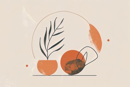 Plakat z serii boho zatytułowany Tonacja Pasteli. Plakat przedstawia harmonijną kompozycję elementów natury i abstrakcyjnych kształtów. Widzimy doniczkę z delikatną rośliną o czarnych, smukłych liściach, które delikatnie kontrastują z ciepłym odcieniem pomarańczy naczynia. Towarzyszą jej geometryczne formy: dwa krągłe kształty w tonacji ziemi, które przeplatają się, tworząc iluzję przestrzeni i głębi. Rysunek uzupełnia subtelna linia horyzontu i rozproszone kropki, dodające plakatowi dynamiki. Idealnie sprawdzi się jako element dekoracyjny w pomieszczeniach, gdzie dominuje spokój i równowaga, takich jak jasne, przestronne salony, pokoje do medytacji lub ciche zakątki bibliotek.