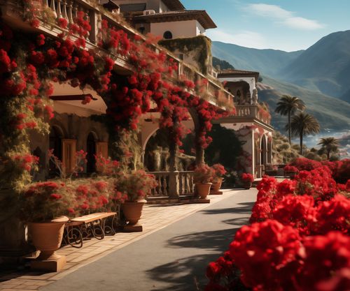 Plakat z serii pejzaże zatytułowany Czerwona Idylla, przedstawia romantyczną scenę otuloną w bujne, kwitnące bougainvillea, które zdobią klasyczną architekturę z widokiem na malownicze wzgórza. Czerwone kwiaty przypominające klejnoty, kontrastujące z ciepłą paletą pastelowych ścian i żywej zieleni, przywołują uczucie wiecznego lata. To arcydzieło znakomicie komponowałoby się w przestronnych, jasnych przestrzeniach, takich jak rezydencje w stylu śródziemnomorskim, ekskluzywne spa czy jako element wyróżniający w eleganckich restauracjach, zapraszając do marzeń o długich, leniwych dniach nad Morzem Śródziemnym.