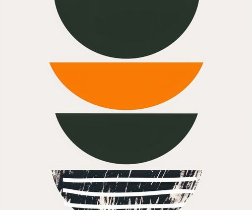 Plakat z serii boho zatytułowany Gra Tekstur to połączenie czystych, geometrycznych form z wyrazistą grą tekstur. Trzy półkoliste kształty w odcieniach głębokiej zieleni i żywej pomarańczy są ułożone w precyzyjny stos, tworząc zaskakującą głębię i zmysłową symetrię. Najniższa forma przerywa ten porządek, wprowadzając do dzieła dynamiczne, surowe detale, przypominające efekt artystycznego, spontanicznego malowania lub drapowania. Ten plakat jest idealnym wyborem dla wnętrz, które doceniają silne, graficzne elementy oraz surowy, industrialny klimat, pasując zarówno do minimalistycznych, jak i bardziej eklektycznych przestrzeni.
