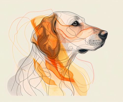 Plakat z serii abstrakcja zatytułowany Kontur Profilowego. Plakat przedstawia portret psa w stylu artystycznym, z subtelnie zaznaczonymi, ale wyraźnymi cechami. Kompozycja łączy realistyczne detale takie jak oczy, nos i uszy z abstrakcyjnymi, płynnymi liniami i plamami kolorów, które tworzą wrażenie ruchu i głębi. Dominujące kolory to odcienie pomarańczowego, żółtego i brązu, które idealnie oddają ciepło i przyjazny charakter zwierzęcia. Tło w neutralnym, pastelowym odcieniu podkreśla i równoważy bardziej dynamiczne elementy grafiki. Plakat emanuje spokojem i może wzbudzać pozytywne emocje, będąc jednocześnie wyrafinowanym, artystycznym przedstawieniem psa, który może być ulubieńcem rodziny lub po prostu przykuwającym uwagę elementem dekoracyjnym.