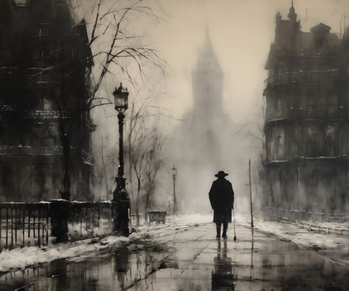 Plakat z serii wnętrza zatytułowany Mgła nad Londynem, przedstawia samotną sylwetkę przechadzającą się po mokrych, połyskujących bruku ulic, otoczoną przez klasyczne kamienice i latarnie uliczne, które rzucają cień na mglistą scenę. Szarości i sepii użyte w dziele podkreślają jego vintage charakter, a zarys wieży w tle przywołuje ikoniczny obraz Londynu. To dzieło sztuki idealnie wpasuje się w przestrzenie, gdzie chce się wywołać atmosferę tajemniczości i klasyki, takie jak biblioteki, salony w stylu retro, czy klasyczne biura prawnicze, zapewniając im wyrafinowany, metaforyczny akcent.