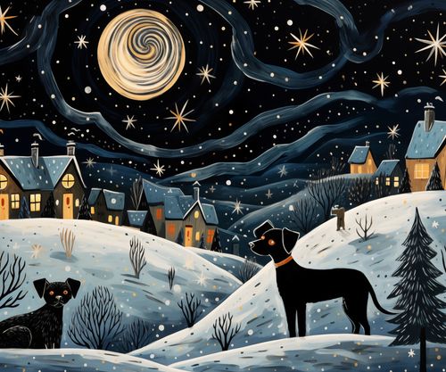 Plakat z serii abstrakcja zatytułowany Nocny Psi Patrol. To urokliwe dzieło sztuki zanurza widza w idyllicznym, zimowym pejzażu, gdzie tajemnicze postacie dwóch czujnych psów wyłaniają się na tle malowniczej wsi oświetlonej ciepłym światłem z okien. Nad sceną unosi się oszałamiające niebo pełne gwiazd z hipnotyzującym wirującym układem, który wywołuje poczucie głębi kosmosu. Śnieżny krajobraz i delikatnie padające płatki śniegu dodają kompozycji spokojnego nastroju, idealnego do kontemplacji i marzeń. Plakat ten będzie doskonałym dodatkiem do przestrzeni takich jak pokoje dziecięce, miejsca wypoczynkowe lub jako ciepły akcent w zimowe wieczory w każdym domu lub kawiarni.