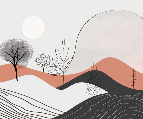 Plakat z serii boho zatytułowany Półcień Widoku.Plakat przedstawia oniryczny pejzaż, gdzie delikatne linie drzew przenikają przez łagodne, faliste wzgórza. Ciepłe odcienie czerwieni i różu przeplatają się z chłodniejszymi szarościami i czernią, tworząc poczucie głębi i spokoju. Subtelna tekstura na niektórych elementach dodaje wrażenia ruchu, a biała sfera w tle przywołuje skojarzenia z pełnią księżyca lub wschodzącym słońcem. Dzieło idealnie wpasuje się w wnętrza o spokojnym charakterze, takie jak stylowe sypialnie, czytelnie lub pokoje relaksacyjne. Może również przynieść element ukojenia i inspiracji do przestrzeni współpracujących, zapewniając wizualną odskocznię od codzienności. Zapewni miękki kontrast we wnętrzach urządzonych w naturalnych materiałach i odcieniach.