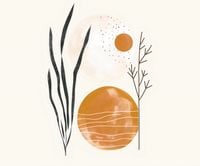Plakat z serii wnętrza zatytułowany Przebłysk. Plakat prezentuje abstrakcyjną kompozycję o spokojnej, naturalnej kolorystyce, z dominującymi odcieniami beżu, pomarańczu i czerni. Centralne miejsce zajmują dwa okręgi, które mogą symbolizować słońce i księżyc lub inne astronomiczne ciała, z subtelnymi detalami przypominającymi krążki planetarne lub satelity. Obok nich znajdują się stylizowane rośliny lub trawy, które swoją smukłą formą i ciemnym kolorem tworzą kontrast wobec jaśniejszego tła. Dodatkowy element graficzny w postaci gałęzi z prostymi liniami przypomina drzewo lub krzew, dodając kompozycji organicznego charakteru. Całość jest utrzymana w stylistyce minimalizmu, z delikatnymi teksturami i rozpryskami, które nadają dziełu lekkości i nowoczesnego wyglądu. Ograniczona paleta barw oraz proste formy sugerują spokój i harmonię, co czyni plakat odpowiednim dla przestrzeni, które mają za zadanie inspirować do wyciszenia i refleksji.
