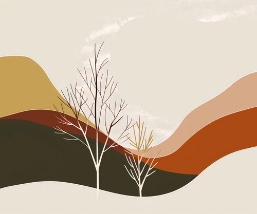 Plakat z serii minimalistyczne zatytułowany Pustynia Widzi. Plakat ukazuje dwie subtelne, ogołocone z liści drzewa, które wyłaniają się z miękkich, falujących form pustynnych wydm. Barwy są stonowane, z dominującymi odcieniami brązu, beżu i terakoty, co oddaje ciepłą i suchą atmosferę pustyni. Tło zawiera tekstury, które mogą przypominać piasek lub delikatną gęstwinę. Ten plakat doskonale sprawdzi się jako dodatek do wnętrz w stylu natur, dodając im ziemiściej palety i przywołując poczucie spokoju oraz prostoty. Będzie się dobrze komponować w przestrzeniach takich jak salon, pokój relaksu, a nawet biuro, wprowadzając elementy spokojnego krajobrazu, które mogą inspirować i uspokajać.