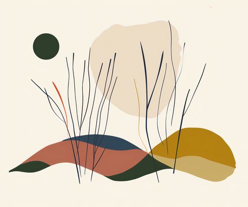 Plakat z serii boho zatytułowany Szept Wiatrów. Grafika przedstawia abstrakcyjny pejzaż, w którym finezyjne, czarne linie wyobrażają łagodnie kołyszące się trawy. Kształty w ciepłych odcieniach ziemi tworzą iluzję wzgórz i ścieżek, a dyskretna zielona kropka w górnym rogu zdaje się być echem oddalającego się słońca lub zapowiedzią zmierzchu. Wszystko to ujęte na tle delikatnego beżu, co nadaje dziełu spokojny, relaksujący nastrój. Plakat ten idealnie wpasuje się w wnętrza, które aspirują do wyciszenia i harmonii z naturą, jak przytulne salony, jadalnie, czy miejsca przeznaczone do medytacji. Może być również pięknym, uspokajającym dodatkiem do biur, bibliotek czy innych przestrzeni wymagających skupienia i spokoju.