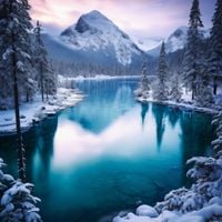 Plakat z serii pejzaże zatytułowany Górzyste Prześwity. Ten plakat ukazuje zachwycający zimowy krajobraz z krystalicznie czystym jeziorem, które odbija lśniące szczyty górskie i pastelowe barwy zachodzącego słońca. Obfite śnieżne pokrywy na drzewach i brzegach jeziora dodają scenie poczucia spokoju i izolacji. Idealny do wnętrz, które chcą wprowadzić elementy spokojnego piękna natury, ten plakat jest doskonałym dodatkiem do przestrzeni mieszkalnych, biurowych lub jako ukojenie w miejscach publicznych, wprowadzając atmosferę wyciszenia i odprężenia.