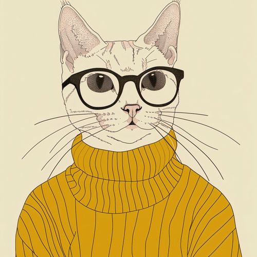 Plakat z serii abstrakcja zatytułowany Intelektualista to urocze przedstawienie kota ubranego w stylowy, żółty golf, dopełnionego okularami w intelektualnym stylu. Ilustracja charakteryzuje się subtelną linią i pastelową kolorystyką, co nadaje jej delikatny i stylowy wygląd. Okulary z grubymi oprawkami nadają kotu wyraz powagi i inteligencji, podczas gdy żółty sweter wskazuje na wyrafinowany gust. Całość kompozycji jest zabawna, ale jednocześnie elegancka, sprawiając, że plakat ten jest idealny dla tych, którzy cenią sobie humor połączony z klasą. Doskonale nadaje się do nowoczesnych przestrzeni mieszkalnych, pokoi młodzieżowych, biur lub jako dekoracja w księgarniach i kawiarniach.