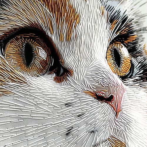 Plakat z serii abstrakcja zatytułowany Niktowany Kot. Ukazuje zbliżenie na twarz kota, wykonane z niezwykłą dbałością o detale, co sprawia wrażenie trójwymiarowości. Całość jest utrzymana w technice przypominającej szycie lub haft, gdzie każda nitka została precyzyjnie ułożona, aby naśladować naturalne linie futra. Olśniewające, złote oczy kota są pełne wyrazu i życia, przyciągają uwagę i są centralnym punktem kompozycji. Złożone z wielu warstw i kolorów linie tworzą dynamiczną i niemal hipnotyzującą teksturę. Plakat ten byłby doskonałym wyborem dla miłośników sztuki i zwierząt, wnosząc element elegancji i oryginalności do każdego wnętrza.