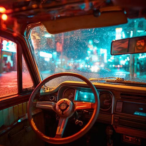 Plakat z serii pop art zatytułowany Nocny Kierowca, przedstawia widok z wnętrza klasycznego samochodu, patrząc przez deszczową, skraplaną szybę na rozświetlone neony miejskiego pejzażu nocą. Ciepłe, czerwone oświetlenie wnętrza samochodu kontrastuje z hipnotyzującym błękitem i elektrycznymi odcieniami świateł zewnętrznych, tworząc intymną, a jednocześnie dynamiczną atmosferę. Kropelki deszczu na szybie dodają tekstury i głębi, sprawiając, że scena jest zarówno realistyczna, jak i liryczna. To dzieło sztuki mogłoby znaleźć swoje miejsce w przestrzeniach nowoczesnych, miejskich loftów lub jako akcent w barze o tematyce retro, wprowadzając element tajemniczości i miejskiego romansu.