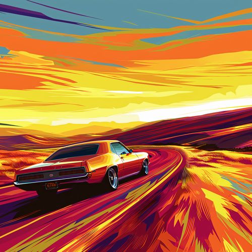 Plakat z serii abstrakcja zatytułowany Pędź Przed Siebie. Prezentuje klasyczny samochód w stylu muscle car, przemierzający pejzaż w kolorach zachodzącego słońca. Dynamiczne linie i żywe barwy od żółci, przez pomarańcz, aż po głębokie czerwienie tworzą wrażenie szybkości i wolności. Sylwetka samochodu, wyraźnie odznaczająca się na tle rozmytych kolorów, podkreśla moc i energię jazdy. Ten plakat idealnie wpasuje się w przestrzenie pełne dynamiki i pasji, takie jak garaże, salony gier, prywatne kina domowe lub nowoczesne salony. Doda on charakteru wnętrzu, inspirując do aktywności i cieszenia się każdą chwilą.