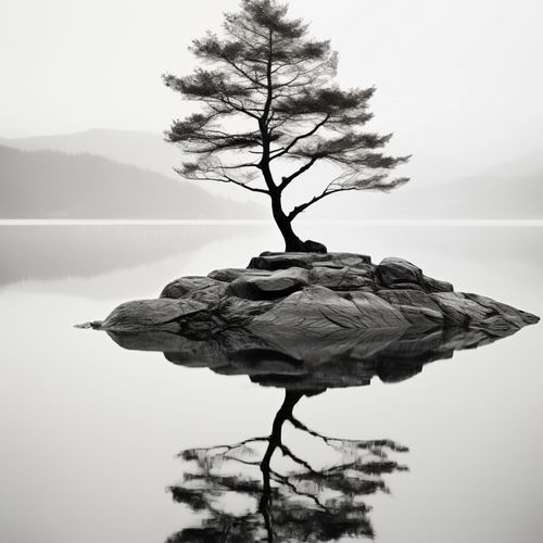 Plakat z serii pejzaże zatytułowany Samotne Drzewo to monochromatyczne zdjęcie prezentujące unikalną scenę – pojedyncze drzewo wyłaniające się z kamiennej wysepki na tle spokojnej, lustrzanej powierzchni wody. Plakat jest ujęciem w tonacji czerni i bieli, co nadaje mu ponadczasowy charakter i podkreśla minimalistyczną estetykę. Silny kontrast między ciemnymi konturami drzewa a jasnym tłem wody tworzy głębię i przykuwa uwagę. Odbicie drzewa w wodzie tworzy symetryczny i spokojny obraz, który może wnosić element spokoju i zamyślenia do każdego otoczenia. Ten plakat będzie doskonałym wyborem dla osób ceniących naturę, minimalizm oraz sztukę fotograficzną, idealny do powieszenia w salonie, biurze, czy jako element dekoracyjny w przestrzeniach wellness i spa.