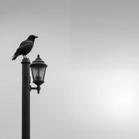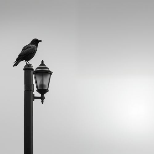 Obraz z serii wnętrza zatytułowany Samotny Postój Kruka. Prezentuje on sylwetkę kruka spoczywającego na klasycznej latarni ulicznej, uchwyconą w monochromatycznej palecie szarości. Ten spokojny, lecz sugestywny plakat jest symbolem refleksji i tajemnicy, doskonale wpisując się w klimat współczesnych przestrzeni miejskich. Praca ta z pewnością stanie się wyrazistym dodatkiem do nowoczesnych wnętrz, takich jak lofty czy minimalistyczne salony, a także wniesie element zastanowienia do przestrzeni publicznych takich jak galerie, kawiarnie i biblioteki, gdzie odosobnienie miesza się z miejskim zgiełkiem.