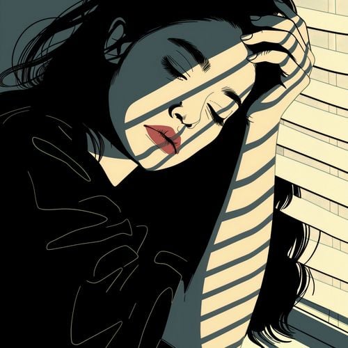 Plakat z serii abstrakcja zatytułowany Zamysł. Plakat przedstawia kobietę z zamyślonym wyrazem twarzy, z głową opartą na dłoni, co sugeruje moment introspekcji lub smutku. Silne cienie i linie świetlne tworzące prążki na jej twarzy dodają głębi kompozycji, a kontrastująca paleta kolorów z dominującymi odcieniami niebieskiego i czerni, podkreślona akcentem czerwieni ust, potęguje emocjonalne napięcie dzieła. Ten plakat może symbolizować skomplikowane emocje ludzkiego doświadczenia i jest idealnym dodatkiem do przestrzeni, które cenią sobie głębię i wyrazistość w sztuce, takich jak salon, studio twórcze, czy miejsce do medytacji.