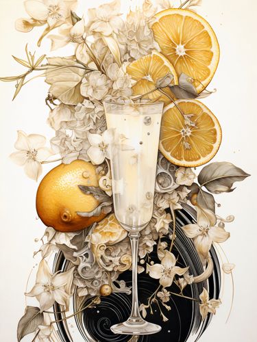 Plakat z serii wnętrza zatytułowany Esencja Cytrusów. Zmysłowy pejzaż ukazuje krystaliczną szampanową kieliszek otoczony bujnym kwiatem i soczystymi plasterkami cytryny. Delikatne białe kwiaty i misternie rysowane detale dodają kompozycji głębi i subtelności, podczas gdy wyraziste żółte akcenty cytryny dodają energii i świeżości. Całość wprowadza w stan relaksu i orzeźwienia, przypominając o chwilach spędzonych na letnich tarasach. Idealnie wpasuje się w eleganckie restauracje, bary koktajlowe lub nowoczesne kawiarnie z akcentami śródziemnomorskimi.
