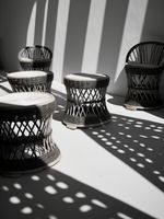 Plakat z serii wnętrza zatytułowany Gra Świateł to stylowa, monochromatyczna fotografia, która oddaje estetykę współczesnego designu. Na fotografii widzimy zestaw eleganckich, plecionych stołków z rattanu ustawionych na tle geometrycznych cieni. Ostre linie cieni przełamują okrągłe kształty mebli, tworząc fascynującą kompozycję pełną kontrastów. Białe siedziska stołków pięknie kontrastują z ciemniejszymi elementami, a gra światła i cienia nadaje scenie trójwymiarowość i teksturę. Plakat ten będzie doskonały dla miłośników minimalistycznych wnętrz, a także dla osób poszukujących elementu dekoracyjnego, który wprowadzi do pomieszczenia nowoczesny i artystyczny akcent. Idealny do nowoczesnych przestrzeni mieszkalnych, biur, kawiarni lub galerii sztuki.