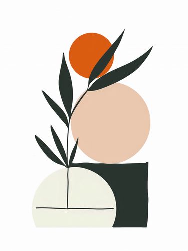 Plakat z serii boho zatytułowany Kompozycja Natury. Grafika łączy proste formy geometryczne z elementami przyrody, tworząc obraz, który jest jednocześnie nowoczesny i organiczny. Zestawienie gładkich, zaokrąglonych kształtów z ostrymi, ciemnymi liśćmi wprowadza wizualne napięcie, a pomarańczowa kula na wierzchołku gałązki przypomina zachodzące słońce lub soczysty owoc. Palecie barw dominują stonowane odcienie, które razem tworzą kojącą i zrelaksowaną atmosferę.Dzieło to doskonale sprawdzi się w przestrzeniach, które aspirują do stworzenia spokojnego i zbalansowanego wnętrza, takich jak jadalnie, poczekalnie lub pokoje relaksacyjne. Może także pełnić funkcję spajającą w pomieszczeniach z elementami zielonymi, takimi jak domowe ogrody zimowe czy salony w stylu eko.