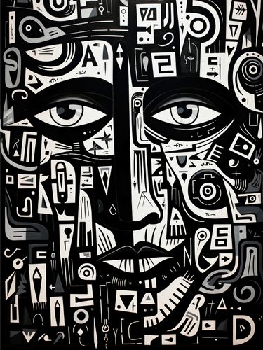 Plakat z serii abstrakcja zatytułowany Labirynt Myśli. Intrygujące oczy spoglądające z głębi obrazu są otoczone złożonymi wzorami i symbolami, które łączą się, tworząc enigmatyczny portret. Czarno-białe barwy kontrastują ze sobą, dodając dziełu intensywności i głębi. Złożoność wzorów symbolizuje skomplikowane myśli i emocje, które kryją się za ludzkim spojrzeniem. Świetnie sprawdzi się w nowoczesnych biurach, galeriach sztuki oraz w przestrzeniach przeznaczonych dla miłośników abstrakcyjnej ekspresji.