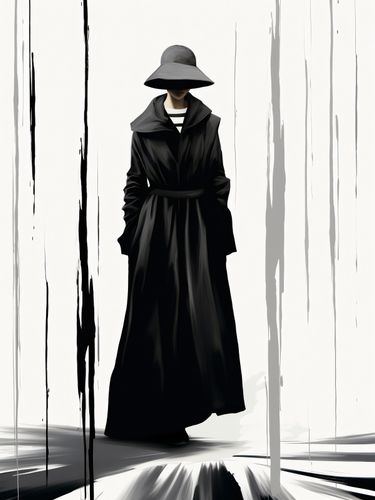 Plakat z serii wnętrza zatytułowany Mroczna Taina. Enigmatyczna postać w czarnym płaszczu i szerokim kapeluszu ukrywa swoją tożsamość, podkreślając aura tajemniczości. Czarno-białe tło z pionowymi smugami przypominającymi deszcz lub płynący atrament dodaje głębi i dramatyzmu kompozycji. Subtelne niuanse światła i cienia grają na powierzchni płaszcza, tworząc atmosferę intrygi i nieokreślonego niebezpieczeństwa. Świetnie sprawdzi się w nowoczesnych galeriach sztuki, luksusowych hotelach o minimalistycznym designie oraz w przestrzeniach przeznaczonych dla miłośników noir i kryminałów.