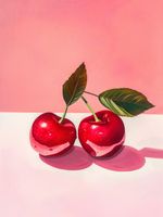 Plakat z serii wnętrza zatytułowany Soczyste Oczywiste ukazuje dwa soczyste, lśniące wiśnie z dwoma zielonymi liśćmi, które są połączone w jedną gałązkę, na pastelowym różowym tle z białą powierzchnią, na której odbijają się owoce. Wiśnie są przedstawione w realistycznym stylu, z widocznymi refleksami światła i kroplami wody, co nadaje im świeży i apetyczny wygląd. Zastosowanie cieni i światłocienia nadaje kompozycji głębi i trójwymiarowości. Dominujące ciepłe odcienie różu i czerwieni tworzą przyjemną i słodką atmosferę. Plakat może być interpretowany jako celebracja lata i dojrzałych owoców lub jako minimalistyczne podejście do tematu natury morte w nowoczesnym wydaniu. Idealnie nadawałby się jako element dekoracyjny do kuchni lub jadalni, wprowadzając żywy i kolorowy akcent.