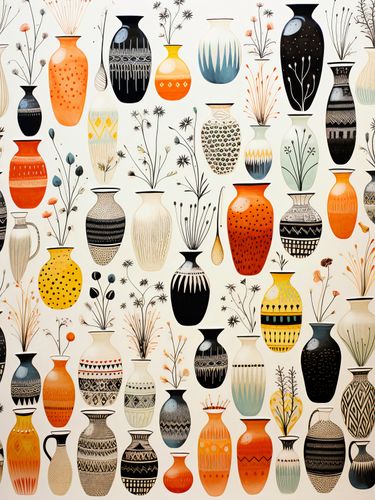Plakat z serii wnętrza zatytułowany Symfonia Wazonów. Wspaniałe wazony w bogatej palecie kolorów, od głębokiej czerni do ciepłych odcieni pomarańczu, tworzą intrygującą mozaikę wzorów i kształtów. Delikatne motywy roślinne, które zdobią niektóre wazony, dodają uroku i lekkości, a różnorodność wzorów i faktur przyciąga wzrok i zaprasza do głębszej refleksji. Kontrast między jasnymi i ciemnymi barwami, a także subtelne niuanse w każdym wazonie, dodają tej kompozycji głębi i dramatu. Ten artystyczny plakat doskonale wpisuje się w klimat wyrafinowanych galerii sztuki, eleganckich kawiarni oraz nowoczesnych przestrzeni mieszkalnych, które stawiają na unikatowy design.