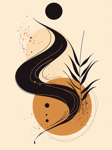 Plakat z serii minimalistyczne zatytułowany Tańcuj. Grafika cechuje się płynnymi, zakręconymi liniami, które tworzą dynamiczną kompozycję przypominającą taniec wiatru z trawami. Beżowe tło z akcentami w odcieniach czerni i złota dodaje elegancji i głębi, a rozpryski i krople tuszu wprowadzają element spontaniczności i naturalnego piękna. Plakat ten oddaje wrażenie ruchu i lekkości, będąc jednocześnie nowoczesnym i wyrafinowanym. Doskonale sprawdzi się jako artystyczny akcent w minimalistycznych i nowoczesnych wnętrzach, nadając im charakteru i wyrafinowania. Idealny do salonu, pokoju kreatywnego lub jako subtelny, ale wyrazisty element w przestrzeni biurowej.