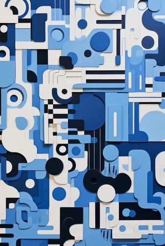 Plakat z serii geometria zatytułowany Niebieski Labirynt. Złożona mozaika geometrycznych kształtów i różnorodnych tekstur w odcieniach niebieskiego i bieli układa się w fascynującą kompozycję przypominającą miasto z lotu ptaka. Kontrasty głębokich granatów z pastelowymi błękitami oraz gładkimi i wypukłymi powierzchniami dodają głębi i trójwymiarowości temu dziełu. Świetnie sprawdzi się w nowoczesnych biurach, przestrzeniach designerskich oraz galeriach sztuki współczesnej.