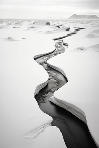 Plakat z kolekcji pejzaże zatytułowany Meandry Mrozu. Ten plakat przedstawia sinący lodowiec, którego szczeliny przecinają śnieżnobiałą powierzchnię, tworząc naturalne dzieło sztuki. Monochromatyczna paleta barw, gdzie biel śniegu kontrastuje z głębokim czerniami wód lodowcowych, przemawia do wyobraźni i wywołuje uczucie surowości oraz majestatu natury. Doskonały do wnętrz o minimalistycznym designie lub jako mocny wizualny akcent w przestrzeniach takich jak salony, biura i lobby hotelowe, gdzie może inspirować do refleksji nad pięknem i siłą przyrody.