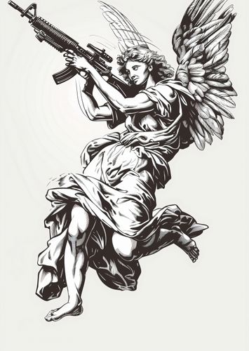 Plakat z serii pop art zatytułowany Anioł Wojny. Przedstawia on postać anioła w klasycznym stylu, jednak z nieoczekiwanym elementem współczesnym – trzyma on broń, co jest zaskakującym połączeniem tradycyjnej symboliki z nowoczesnymi motywami. Ta silna wizualna metafora może prowokować do refleksji na temat konfliktów, pokoju i dwoistości natury ludzkiej. Zastosowanie monochromatycznej kolorystyki wzmacnia dramatyzm kompozycji, a sama praca może stanowić wyrazisty akcent w nowoczesnych przestrzeniach, które cenią sobie głęboką symbolikę i odważne wyraz artystyczny.