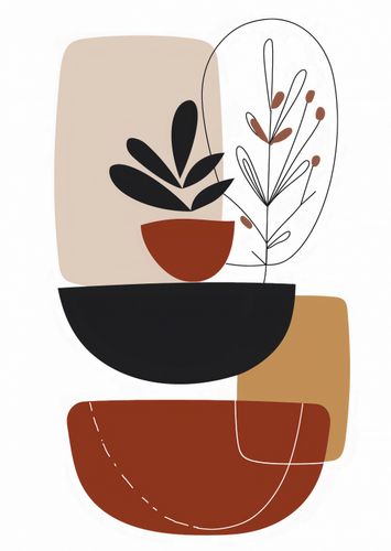 Plakat z serii minimalistyczne zatytułowany Botaniczna Abstrakcja. To artystyczne dzieło przedstawia stylizowane, botaniczne motywy ukryte wśród geometrycznych form. Delikatne rośliny w doniczkach uchwycone są w prostych, ale wyrafinowanych konturach, zaznaczających ich sylwetki na tle złożonego z ciepłych i neutralnych barw tła. Brązy i beże splatają się tu z głęboką czerwienią, tworząc organiczne poczucie natury uproszczonej do esencji formy. Ten plakat doskonale odnajdzie się w przestronnych, jasnych wnętrzach, gdzie natura spotyka się z minimalizmem - idealny do salonów w stylu skandynawskim, spokojnych gabinetów, lub jako ukojenie w dynamicznym, miejskim biurze.