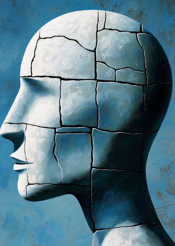 Plakat z serii abstrakcja zatytułowany Defragmentacja Dysku przedstawia abstrakcyjny portret ludzkiej głowy, której powierzchnia przypomina popękaną ceramikę. Wyraziste pęknięcia podkreślają strukturę twarzy i mogą symbolizować złożoność ludzkiego umysłu, jego podatność na zmiany i przemijanie, lub rozbudowaną naturę myśli i emocji. Niebieskie tło kontrastuje z bielą i cieniami na twarzy, dodając głębi i podkreślając kontemplacyjny nastrój dzieła. Ten plakat mógłby być idealny dla przestrzeni kreatywnych, takich jak studia artystyczne, gabinety psychologiczne lub jako element zastanawiający w nowoczesnych biurach i mieszkaniach, zachęcający do refleksji nad ludzką kondycją i wewnętrznym życiem umysłu.
