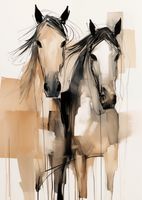 Plakat z serii wnętrza zatytułowany Dusze na Wolności. Ten artystyczny obraz przedstawia dwie abstrakcyjne sylwetki koni, uchwycone w dynamicznych, niemal eterycznych pociągnięciach pędzla. Neutralna paleta barw z dominującymi odcieniami beżu i czerni, podkreślona jest przez akcenty i plamy, co nadaje dziełu głębi i tekstury. Artystyczne, swobodne linie i plamy tuszu tworzą wrażenie ruchu i wolności, wywołując emocjonalne rezonanse z widzem. Plakat jest idealnym wyborem dla miłośników koni, sztuki współczesnej i abstrakcyjnego ekspresjonizmu, będąc nie tylko dekoracją, ale także wyrafinowanym elementem w przestrzeniach takich jak salony, biura, czy galerie sztuki.