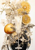 Plakat z serii wnętrza zatytułowany Esencja Cytrusów. Zmysłowy pejzaż ukazuje krystaliczną szampanową kieliszek otoczony bujnym kwiatem i soczystymi plasterkami cytryny. Delikatne białe kwiaty i misternie rysowane detale dodają kompozycji głębi i subtelności, podczas gdy wyraziste żółte akcenty cytryny dodają energii i świeżości. Całość wprowadza w stan relaksu i orzeźwienia, przypominając o chwilach spędzonych na letnich tarasach. Idealnie wpasuje się w eleganckie restauracje, bary koktajlowe lub nowoczesne kawiarnie z akcentami śródziemnomorskimi.