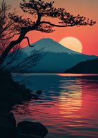 Plakat z serii motywy wschodnie zatytułowany Góra Wieczorem. Urokliwe przedstawienie ikonicznej góry o zachodzie słońca, gdzie ciepłe odcienie czerwieni i pomarańczy rozlewają się po niebie i wodnej tafli, tworząc lustrzane odbicie. Sylwetka drzewa i góry na tle zachodzącego słońca wprowadzają atmosferę zen i wewnętrznej równowagi. Idealny dla miłośników estetyki wabi-sabi i minimalizmu, doskonale wpasuje się w nowoczesne wnętrza, a także wszędzie tam, gdzie pragnie się wprowadzić element uspokajającej natury.