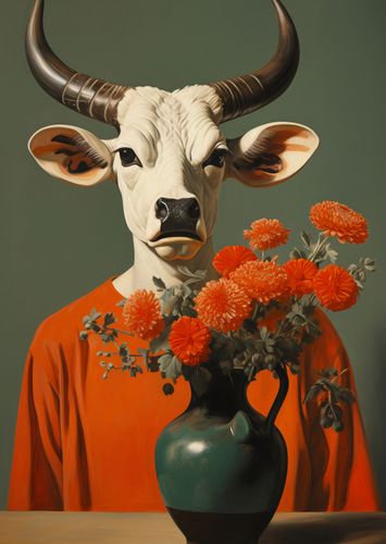 Plakat z serii wnętrza zatytułowany Harmonia Kontrastów. Byk o majestatycznym wyglądzie z intensywnym spojrzeniem, podkreślany przez imponujące rogi i białą sierść, staje w kontraście z delikatnością kwiatów pomarańczowych, które zdobią jego otoczenie. Pomarańczowa tunika, którą nosi, łączy się z barwą kwiatów, tworząc jednolitą paletę barw. Te zaskakujące połączenie elementów dodaje obrazowi nuty fantazji i oryginalności. Idealnie wpisuje się w nowoczesne wnętrza oraz galerie sztuki, gdzie ekscentryczność i kreatywność są na pierwszym planie.