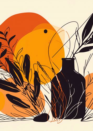 Plakat z serii minimalistyczne zatytułowany Jaskrawy Zachód. Na grafice widnieje silnie stylizowany motyw roślinny, gdzie czarne sylwetki roślin kontrastują z jaskrawo pomarańczowym i żółtym tłem, przypominającym zachodzące słońce. W tle pojawiają się delikatne, abstrakcyjne linie i kształty, dodające kompozycji głębi i tekstury.Ten plakat doskonale wpasuje się w wnętrza ożywione roślinnością, zarówno te domowe, jak i komercyjne przestrzenie typu kawiarnie lub sklepy z roślinami. Jego ciepłe barwy będą wprowadzać przytulną atmosferę i mogą stanowić żywy akcent w przestrzeniach utrzymanych w naturalnej kolorystyce.