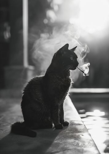 Plakat z serii wnętrza zatytułowany Kocia Przerwa. Na tym plakacie uwieczniono czarnego kota siedzącego na krawędzi, zanurzonego w promieniach rozproszonego światła, które podkreślają jego błyszczącą sierść i wyraziste kontury. Kocie wąsy delikatnie zarysowane w kontraście ze światłem nadają mu wyrazistości, a unoszący się dym tworzy aurę tajemniczości. Jest to plakat zarówno elegancki, jak i zagadkowy, idealny dla miłośników zwierząt i minimalistycznego designu. Plakat ten będzie pasował do każdego wnętrza, od klasycznego po nowoczesne, dodając subtelnego charakteru i spokoju.