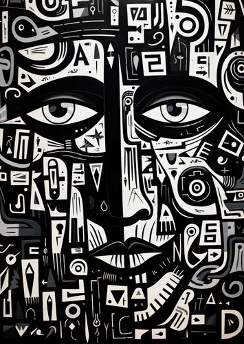 Plakat z serii abstrakcja zatytułowany Labirynt Myśli. Intrygujące oczy spoglądające z głębi obrazu są otoczone złożonymi wzorami i symbolami, które łączą się, tworząc enigmatyczny portret. Czarno-białe barwy kontrastują ze sobą, dodając dziełu intensywności i głębi. Złożoność wzorów symbolizuje skomplikowane myśli i emocje, które kryją się za ludzkim spojrzeniem. Świetnie sprawdzi się w nowoczesnych biurach, galeriach sztuki oraz w przestrzeniach przeznaczonych dla miłośników abstrakcyjnej ekspresji.