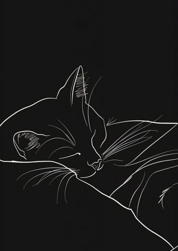 Plakat z serii minimalistyczne zatytułowany Nocny Spokój przedstawia subtelnie zarysowanego kota głęboko pogrążonego we śnie, umieszczonego na tle czarnej, nieskończonej przestrzeni. Białe linie delikatnie kreślą kształt zwierzęcia, uwypuklając jego spokojną postawę i łagodne rysy twarzy. To proste, lecz wyraziste dzieło sztuki przepełnione jest spokojem i elegancją, a kontrastowy czarno-biały motyw przyciąga wzrok i wprowadza do wnętrza atmosferę tajemniczości i wyciszenia. Idealny dla przestrzeni, które są azylem relaksu i odpoczynku, jak sypialnie czy zakątki do medytacji.