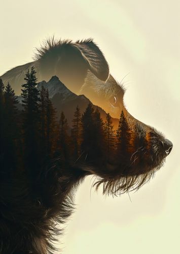 Plakat z serii natura zatytułowany Psi Duch Lasu ukazuje zjawiskowe połączenie sylwetki psa z krajobrazem górskim. Pięknie uchwycony profil psa, z jego czujnym spojrzeniem i delikatnymi liniami twarzy, płynnie przechodzi w malownicze góry, które wyłaniają się z jego sylwetki. Drzewa sosnowe i złociste światło zachodzącego słońca tworzą tło, które emanuje spokojem i harmonią. Kontur psa jest wyraźnie zarysowany, a jednocześnie subtelnie stapia się z przyrodą, co podkreśla nierozerwalną więź między zwierzętami a ich naturalnym środowiskiem. Ten plakat idealnie wpasuje się w wnętrza inspirowane naturą, w salonach miłośników zwierząt lub jako dekoracja w weterynaryjnych poczekalniach, przypominając o pięknie i sile natury oraz naszej odpowiedzialności za jej ochronę.