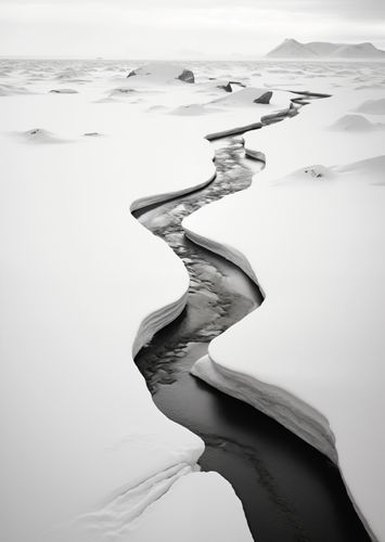 Plakat z kolekcji pejzaże zatytułowany Meandry Mrozu. Ten plakat przedstawia sinący lodowiec, którego szczeliny przecinają śnieżnobiałą powierzchnię, tworząc naturalne dzieło sztuki. Monochromatyczna paleta barw, gdzie biel śniegu kontrastuje z głębokim czerniami wód lodowcowych, przemawia do wyobraźni i wywołuje uczucie surowości oraz majestatu natury. Doskonały do wnętrz o minimalistycznym designie lub jako mocny wizualny akcent w przestrzeniach takich jak salony, biura i lobby hotelowe, gdzie może inspirować do refleksji nad pięknem i siłą przyrody.