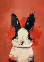 Plakat z serii abstrakcja zatytułowany Uśmiech! przedstawia wizerunek królika w stylistyce inspirowanej street art'em. Tło w ciepłej, czerwonej kolorystyce jest pokryte energicznymi plamami i rozpryskami farby, nadając dynamizmu całości kompozycji. Królik jest przedstawiony frontowo, z głową skierowaną prosto na widza. Jego uszy są wyraziste, czarne z białymi akcentami, co daje efekt trójwymiarowości. Urocza twarz zwierzęcia z subtelnym uśmiechem i charakterystycznymi wąsami wydaje się emanować spokojem i ciepłem. Detale takie jak tekstura futra królika są zaznaczone delikatnymi liniami i cieniowaniem, co dodaje realizmu i głębi grafice. Plakat ten sprawdziłby się jako dekoracja w przestrzeniach współczesnych, które cenią sobie oryginalność i lekkość wizualną, a jednocześnie wprowadza przytulny, domowy nastrój.