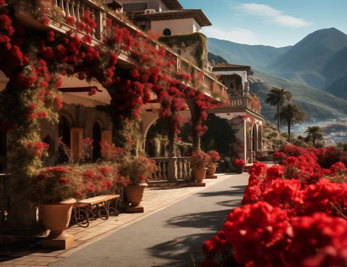 Plakat z serii pejzaże zatytułowany Czerwona Idylla, przedstawia romantyczną scenę otuloną w bujne, kwitnące bougainvillea, które zdobią klasyczną architekturę z widokiem na malownicze wzgórza. Czerwone kwiaty przypominające klejnoty, kontrastujące z ciepłą paletą pastelowych ścian i żywej zieleni, przywołują uczucie wiecznego lata. To arcydzieło znakomicie komponowałoby się w przestronnych, jasnych przestrzeniach, takich jak rezydencje w stylu śródziemnomorskim, ekskluzywne spa czy jako element wyróżniający w eleganckich restauracjach, zapraszając do marzeń o długich, leniwych dniach nad Morzem Śródziemnym.