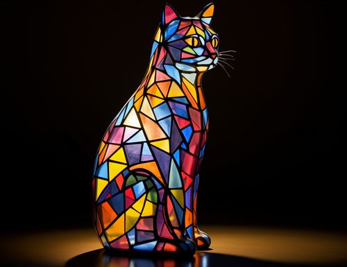 Plakat z serii abstrakcja zatytułowany Koci Witraż. Ten plakat przedstawia artystyczną ilustrację kota, który jest stylizowany na witraż. Zwierzę jest zbudowane z wielu kolorowych, geometrycznych kształtów, które przypominają szklane fragmenty witraża. Barwy są żywe i różnorodne, z przewagą odcieni niebieskiego, czerwonego, żółtego i pomarańczowego, tworząc wizualną ucztę, która zarówno przykuwa uwagę, jak i przyjemnie dla oka. Kot jest przedstawiony w profilu, siedząc z eleganckim, dostojnym położeniem, co dodaje ilustracji majestatycznego charakteru. Tło jest proste i ciemne, co pozwala na to, aby kolory kota były jeszcze bardziej wyraziste. Ta praca może być interpretowana jako hołd dla klasycznej formy sztuki, jaką jest witraż, połączony z nowoczesną grafiką cyfrową, tworząc unikalne i współczesne dzieło sztuki.