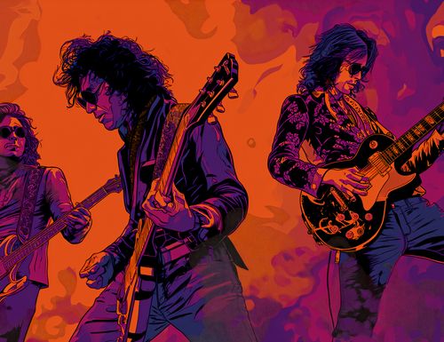 Plakat z serii pop art zatytułowany Mamy To Flow. Obrazuje trzech gitarzystów zanurzonych w pasji muzyki, z instrumentami w rękach, oddając ducha rock'n'rolla. Intensywne kolory, w tym głębokie odcienie pomarańczu i fioletu, tworzą tło, które pulsują energią i rytmem. Plakat oddaje esencję koncertowej atmosfery i jest hołdem dla klasycznych rockowych wirtuozów. Znakomicie wpasuje się w przestrzenie kulturalne, takie jak sale koncertowe, studia muzyczne, jak również jako żywiołowy akcent dekoracyjny w młodzieżowych pokojach czy salonach miłośników muzyki.