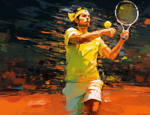 Plakat z serii abstrakcja zatytułowany Mistrzowski Serwis. Na tym żywiołowym dziele sztuki widzimy sylwetkę tenisisty w pełnym ruchu, wykonującego potężny serwis. Stylizacja obrazu przypomina impresjonistyczne pociągnięcia pędzla z żywymi plamami farby, które tworzą dynamiczny, prawie abstrakcyjny obraz akcji na korcie tenisowym. Barwy, od ciepłych żółci i pomarańczy do intensywnych cieni, podkreślają energię i pasję sportowej rywalizacji. To dzieło sztuki oddaje siłę, skupienie i elegancję tenisowej gry, będąc idealnym akcentem dla przestrzeni sportowych oraz dla miłośników i entuzjastów tenisa.
