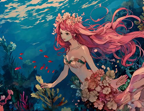 Plakat z serii wnętrza zatytułowany Nimfa Oceanu przedstawia eteryczną postać kobiecą zatopioną w głębinach morskich. Jej długie, różowe włosy płyną z prądem wody, mieszając się z otaczającymi ją kwiatami i roślinami morskimi. Czerwone ryby dodają akcentu kolorystycznego, tworząc wrażenie ruchu i życia pod wodą. Postać nimfy, z jej delikatną sylwetką i spokojnym wyrazem twarzy, stanowi centralny punkt kompozycji, sugerując spójność człowieka z naturą. Ten oniryczny plakat świetnie sprawdzi się jako element dekoracyjny w przestrzeniach relaksacyjnych takich jak spa, salony piękności, a także jako inspirująca dekoracja do pokoju osobistego lub medytacyjnego, zachęcając do refleksji i wyciszenia.