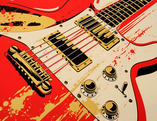 Plakat z serii abstrakcja zatytułowany Przed Graniem. Przedstawia zbliżenie na czerwoną gitarę elektryczną, której design jest wyrazisty i pełen energii. Widać detale instrumentu, takie jak przetworniki, potencjometry i struny, które są wyraźnie zaznaczone kontrastującymi kolorami złota, czerni i bieli na tle intensywnej czerwieni. Rozpryski i plamy farby na korpusie gitary nadają plakatowi surowy, rockowy charakter, co może sugerować żywiołowość i pasję muzyki granej na tym instrumencie. Ten obraz mógłby być atrakcyjnym elementem dekoracyjnym w przestrzeniach dedykowanych muzyce, takich jak sale prób, studia nagraniowe, pokoje młodzieżowe lub jako odważny akcent w nowoczesnym salonie.